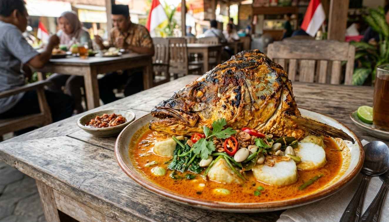 Kombinasi antara tekstur lontong yang lembut dengan kuah santan pedas kepala ikan manyung memberikan sensasi rasa yang luar biasa.